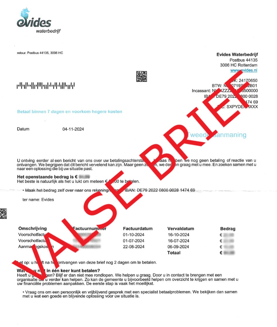 In de phishing brief wordt u gevraagd binnen twee dagen een bedrag van € 54,00 over te maken naar een Duits bankrekeningnummer (IBAN DE79 2022 0800 0028 1474 69). Maak geen geld over, want dit rekeningnummer is niet van Evides.